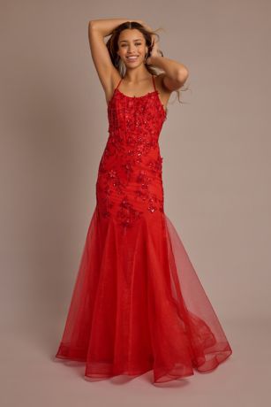 Sequined 3D floral appliques and a lace-up back pair glamorously on this prom dress.