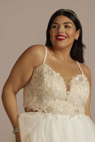 It's your time to sparkle! Add some romance with 3D appliqued flowers, beaded applique straps, and an alluring sweetheart neckline. Pair this dazzling bridal top with a smart suit or a twirlable tulle skirt to create your perfect bridal vibe.