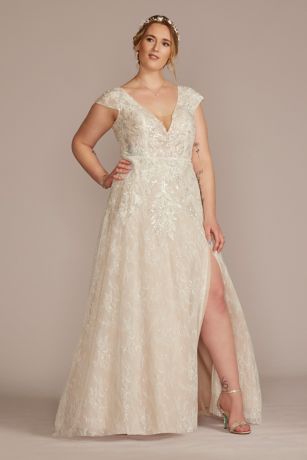 Beaded Lace Cap Sleeve Plus Size Wedding Dre
