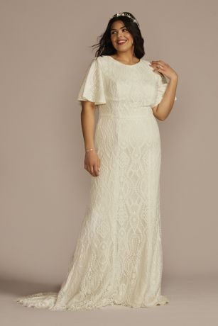 This allover lace embellished wedding gown features a high neckline and flutter sleeves for modesty, while also boasting a stunning scalloped edge trim and sweep train.