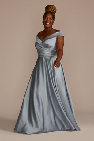 Channel timeless elegance in this satin ball gown featuring an off-the-shoulder sweetheart neckline and delicate side draping on a pleated bodice. The full, sweeping skirt adds a touch of drama to modern sophistication.