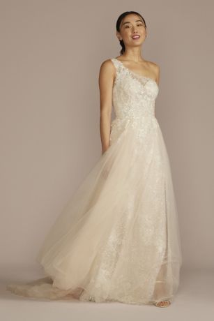 Stunning from every angle, this elegant wedding dress features an eye-catching one-shoulder neckline, a beaded lace bodice, and a beautiful tulle A-line overskirt. When you're ready for your big reveal moment, remove the overskirt to showcase the sparkle of an allover beaded sheath.