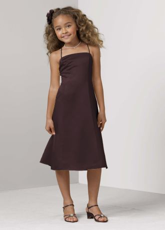This short satin dress has spaghetti straps and a simple silhouette. This can be dressed up with any color sash to match back to the rest of the bridal party. Features an Adjustable Fit for added flexibility and comfort with fewer alterations. Fully lined. Imported polyester. Dry clean.