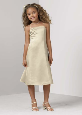 This short satin dress has spaghetti straps and a simple silhouette. This can be dressed up with any color sash to match back to the rest of the bridal party. Features an Adjustable Fit for added flexibility and comfort with fewer alterations. Fully lined. Imported polyester. Dry clean.