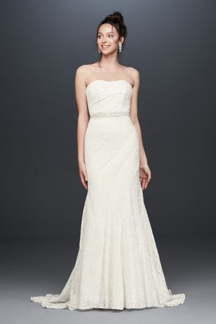 Simple and stunning, this strapless wedding dress stands out with eye-catching details skirt godets and figure-flattering seams that accentuate curves. The crochet-style floral lace features budding petals and blooming flowers that will pop against your bouquet as your walk down the aisle.