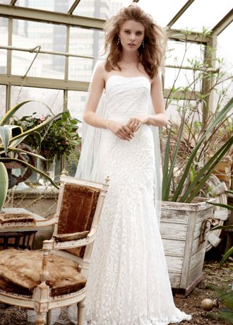 Be picture perfect in this ultra feminine lace gown! Strapless sheath gown features gorgeous all over lace detail and grosgrain ribbon at the waist. Note: Sample styles may be missing the ribbon. Sweep train. Fully lined. Back zip. Imported polyester. Dry clean.
