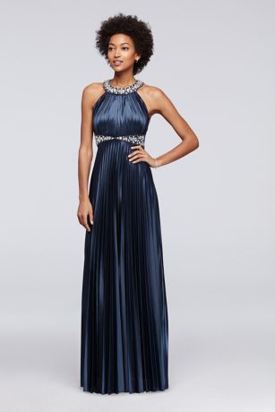 Beaded Strappy Back Halter Prom Dress with Pleats
