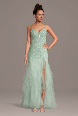 This prom-perfect mermaid dress features a daring plunge neckline, sequin appliques, and a lace-up back. The dramatic tiered skirt completes the glamorous look that's ready for prom or any special occasion.