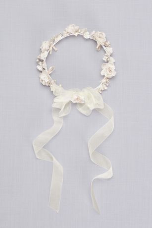 Crafted of fabric blooms and lustrous pearls, this flower girl crown features a statement-making satin bow.