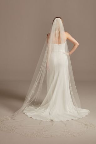 Delicate metallic embroidery and intricate beading form light-catching scrolls on this elegant chapel length veil.