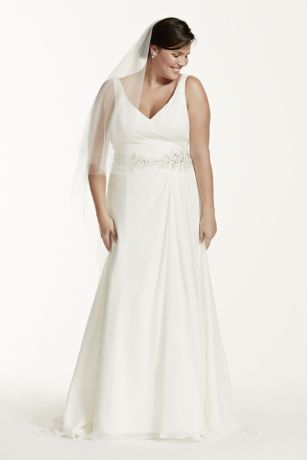 - Chiffon A-line gown with tank neckline features dazzling beaded leaf applique that creates a waistband.