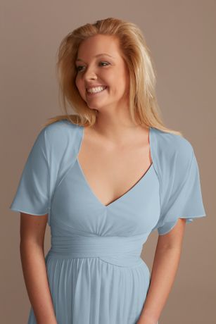 Lightweight and breezy, this soft chiffon bolero capelet with flutter sleeves is perfect for adding some coverage at a summer wedding.Â