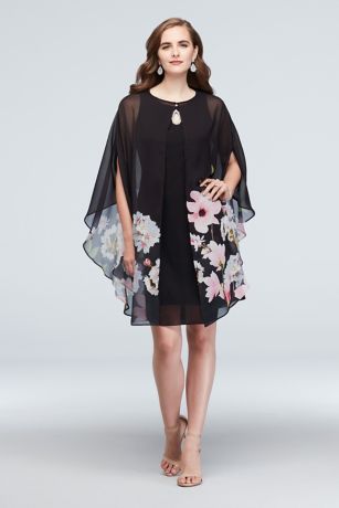You're bound to turn heads wearing this sophisticated dress set, featuring elevated, elegant details like a teardrop-shaped keyhole outlined in pave crystals and gorgeous blooming flowers at the hem of the chiffon capelet.