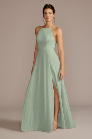 There's so much to love about this chiffon bridesmaid dress, from the high neckline to the A-line skirt with pockets and a slit.