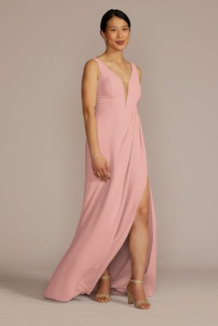 An elegant silhouette with eye-catching details, this chiffon bridesmaid dress delivers with an illusion-inset neckline and side cutouts, draped skirt with slit, side pockets, and bra cups.