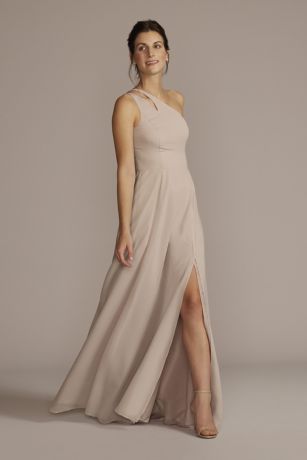 This stunning chiffon bridesmaid dress features a chic one-shoulder design with a trendy cutout detail. The flowing chiffon fabric drapes beautifully, creating an elegant and flattering silhouette. The dress is available in a variety of colors to suit any wedding theme or color scheme. Whether you're a bridesmaid or a guest, this dress is sure to make a statement at any special occasion. Pair it with heels and statement jewelry for a glamorous look that will turn heads. Shop now at David's Bridal to find the perfect dress for your next event.