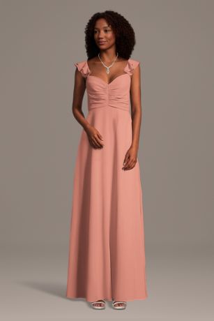 Lightweight chiffon flows beautifully on this A-line dress, designed with soft ruffle sleeves, a ruched bodice, and convenient side pockets. A graceful style with modern ease that's perfect for bridesmaids and partygoers.