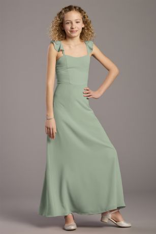 Light and airy, this chiffon A-line dress features delicate ruffle straps for a sweet look that's perfect for junior bridesmaids.