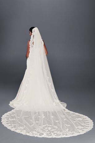Delicate, fluttery fringe finishes the edges of this appliqued, corded lace veil.
