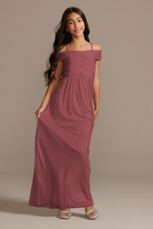 This mesh junior bridesmaid dress features off the shoulder sleeves that create a ruched crisscross bodice. Spaghetti straps complete the look.Â