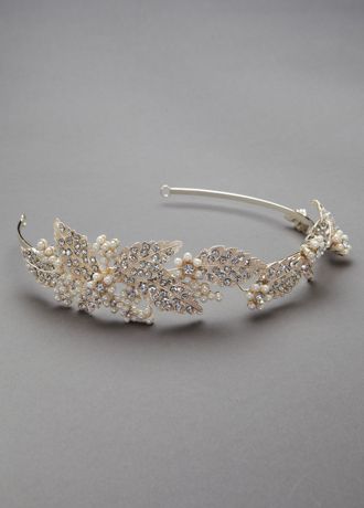 - Crystal leaf motif headband features gorgeous pearl clusters.