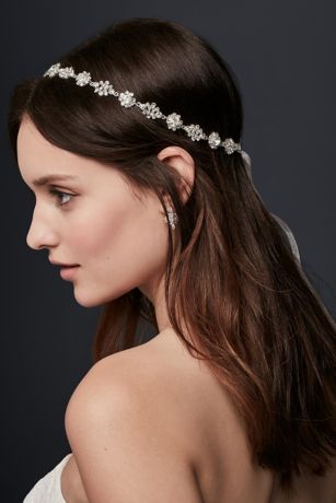 Add some sparkle to your wedding day 'do with the crystal blooms and bursts of this romantic headband, tied with long organza ribbons.