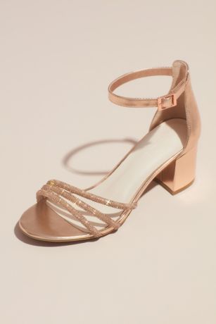 Make a sparkly statement in these metallic block heel sandals featuring a triple band design embellished with rows of glimmering, shimmering crystals.