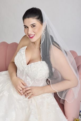 A romantic mid-length veil featuring delicate crystal scalloped edges. Subtle sparkle and elegant drape make it the perfect finishing touch for your bridal look.