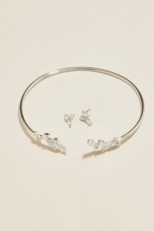 Understated boho beauty shines with cubic zirconia leaves in this stunning adjustable cuff bracelet and earring set.