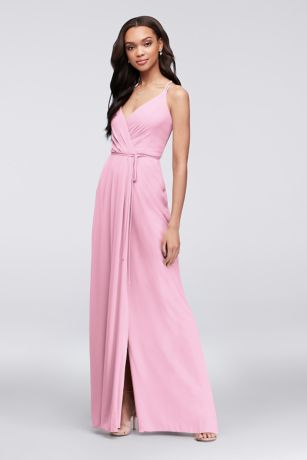 This long georgette bridesmaid dress features true wrap styling, with ties beneath a draped surplice bodice to keep everything in place. A classy side slit offers the perfect opportunity to flaunt some fun shoes.