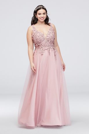 This V-neck ball gown makes a sophisticated statement with detailed floral applique and embellishments on the bodice.