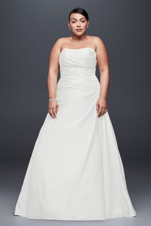 Subtle beading lends a bit of sparkle to the pleated and draped satin of this flattering, plus-size A-line wedding dress.