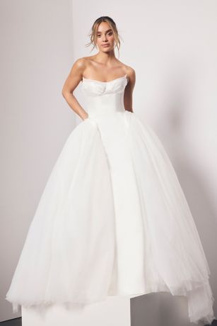Bold contrast defines this Vera Wang Bride ball gown, where a sleek satin bodice meets a voluminous layers of tulle for a look that blends structure with ethereal movement. The strapless bodice features sculpted draping and a drop waist that elongates the figure before cascading into soft, cloudlike fabric for a dramatic finish.