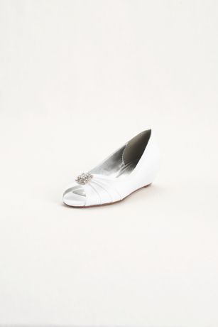 - Dyeable satin wedge peep toe features sparkling rhinestone ornament.