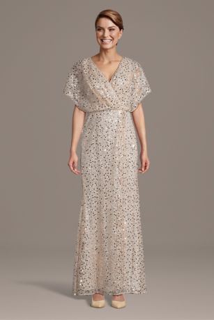 This embellished sheath dress features a softly draped blouson bodice and a flowing sheath silhouette. An elegant choice for mothers of the bride or groom, this elegant style shines beautifully at weddings and special celebrations with a mix of sequins, paillettes, pearls, and metallic embroidery.