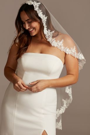 We love the traditional beauty of a mantilla veil, especially when the edge is embroidered with a scrolling floral lace motif.