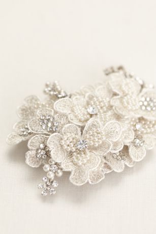 - Embroidered flower clusters are adorned with seed pearls and crystal accents on a clip.