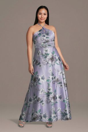 A floral charmeuse halter dress with an A-line skirt for effortless movement and a polished, romantic finish.