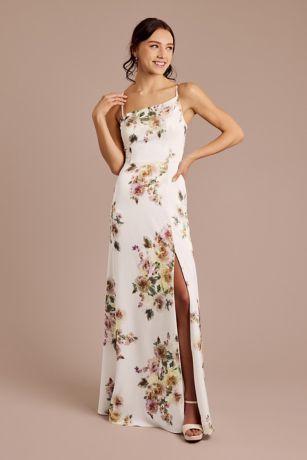Striking asymmetrical straps add a modern twist to this floral matte satin A-line dress with graceful charm for bridesmaids and memorable occasions.