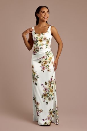 Crafted from luxurious floral matte satin fabric, this square neck tank dress drapes beautifully, with a basque waistline designed to flatter bridesmaids and partygoers alike.