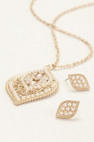 - Necklace and earring set features delicate filigree design and gorgeous pearl floral detailing.