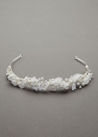 - Flower girl headband features beautiful flower and pearl accents.