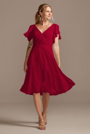 This below-the-knee bridesmaid dress gives an aura of dreamy romance from the softly pleated, plunging-V neckline to the soft, floaty skirt. The faux-wrap style bodice is finished with flutter sleeves.Â