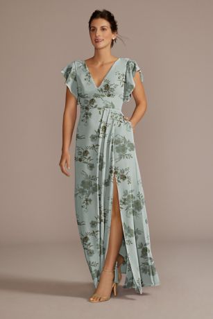This floral print chiffon bridesmaid dress is full of romantic details, from flutter sleeves and a V-neck bodice to an A-line skirt with slit. Features side pockets.