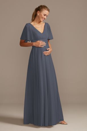 With a flattering crisscross waistband and flowing flutter sleeves, this V-neck mesh maternity bridesmaid dress is a party-pleasing pick. The full skirt has an extra-wide sweep perfect for twirling.Â