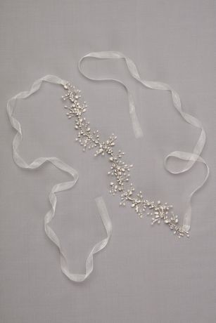 Freshwater pearls with a natural, organic feel pair perfectly with polished crystals for a luxe, lustrous sash. Finished with organza ribbon.