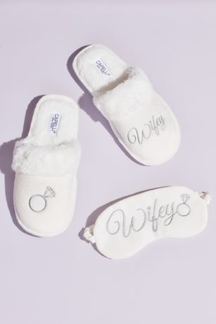 Detailed with a faux-fur cuff and embroidered with the word "Wifey" and a diamond ring, this fuzzy slipper and sleep mask set is the epitome of comfy-chic.