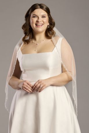 Twinkling beads and luminous pearls trace the edge of this glittering tulle fingertip veil. The light-catching details add just the right amount of shimmer, giving your bridal style an effortlessly romantic finish.