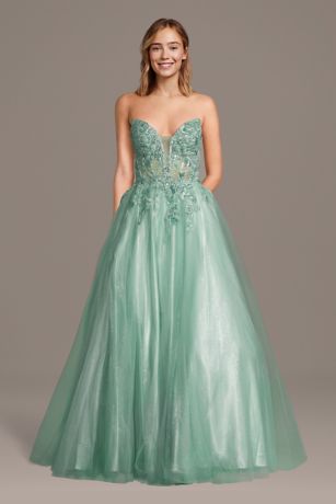 This off-the-shoulder ball gown dazzles in glitter tulle with sparkling appliques and a plunging neckline. A lace-up back and detachable straps add versatility to this glamorous, statement-making look that's perfect for prom.