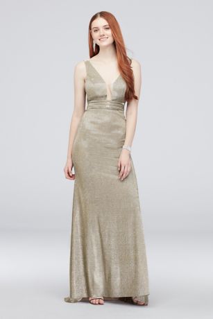 It's all about the details with this shimmery column-style dress. The deep-V neckline is highlighted with an with illusion mesh insert and belted with three sophisticated bands.